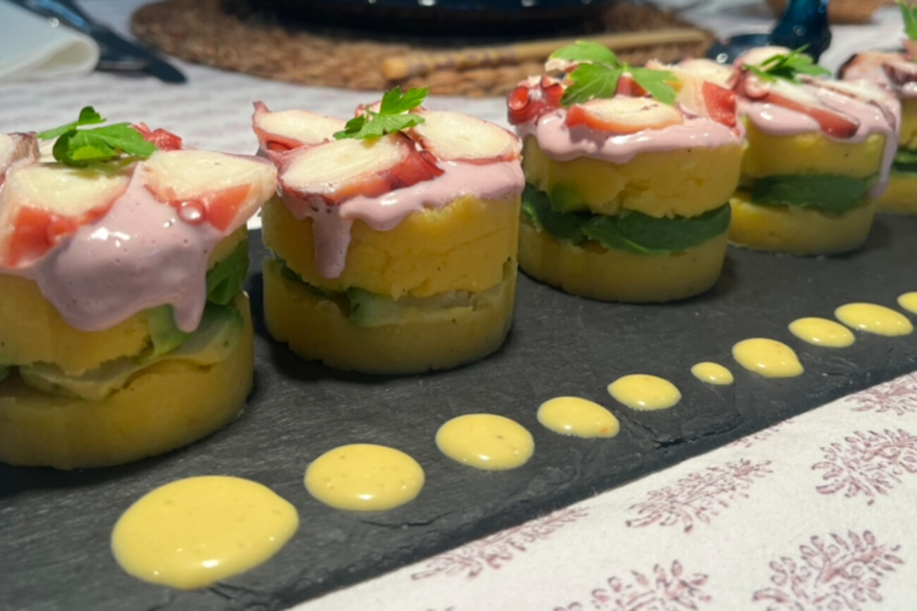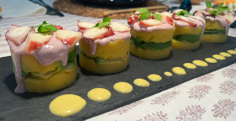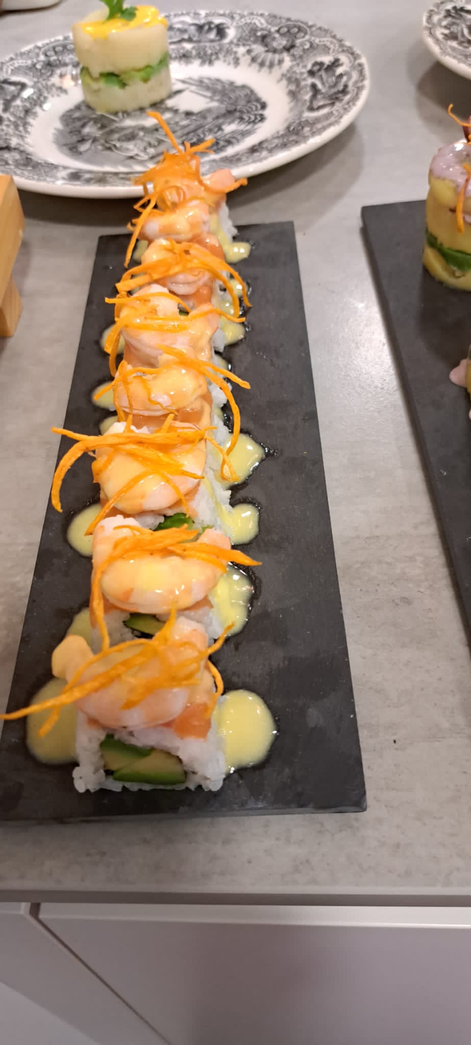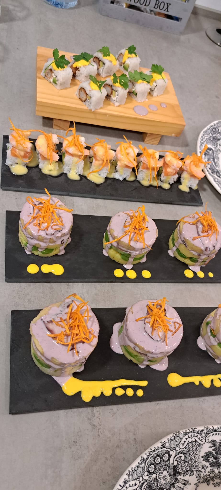 Uramakis de langostino + Causa Limeña con salsa al olivo + Ceviche mixto + Ají de gallina con arroz ……….. 37€ por persona.